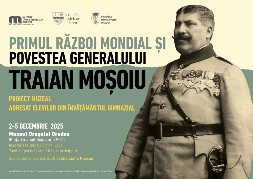 Muzeul Țării Crișurilor Oradea – Complex Muzeal organizează, împreună cu Consiliul Județean Bihor și Primăria Municipiului Oradea, atelierul de educație muzeală PRIMUL RĂZBOI MONDIAL ȘI POVESTEA GENERALULUI TRAIAN MOȘOIU. Acesta se va desfășura în perioada 2-5 decembrie 2025, la Muzeul Orașului Oradea (Piața Emanuil Gojdu nr. 39-41) și este adresat elevilor din învățământul gimnazial.