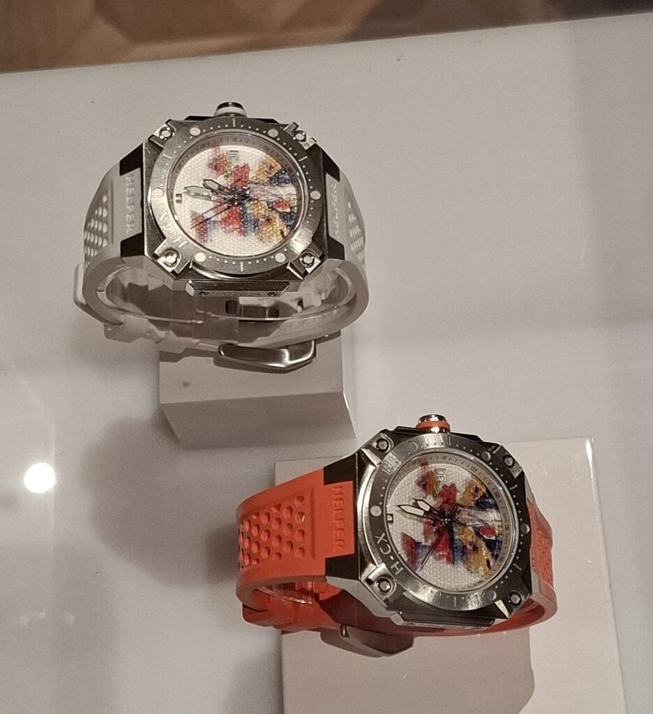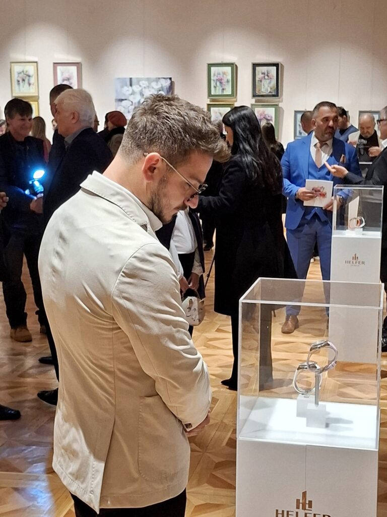 Alăturarea ca fundal, cadran, a unor ceasuri concepute ca podoabe, a acuarelelor Loredanei Popescu-Tăriceanu ridică valoarea designului unor lucruri deja frumoase. Domnul Helfer a spus că a mai fost în orașul nostru și are cunoscuți printre colecționarii de ceasuri de la noi.