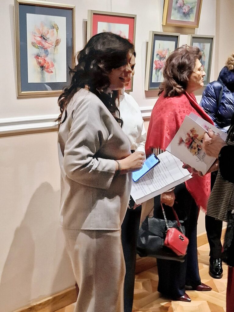 Ne-au fost date multe amănunte despre florile și pasiunea artistei, despre cei patru-cinci ani în care s-a lucrat la această colecție, de preferințele pentru bujori, maci și stânjenei, dar s-a amintit că momentul în care s-a dedicat artei sale este legat de starea de izolare din pandemie, că de fapt artistul este de multe ori singur când creează și caută acea stare de inspirație, de armonie și de liniște sufletească. Artista, puternic marcată de emoții, a adus mulțumiri gazdelor, celor care au sprijinit-o în realizarea proiectului și nu în ultimul rând lui Liviu Helfer, designer și fondatorul mărcii elvețiene Helfer Watches Geneva.
