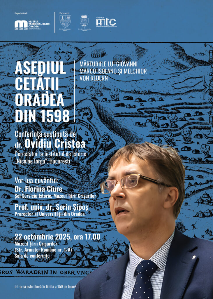 Muzeul Țării Crișurilor Oradea – Complex Muzeal, în parteneriat cu Consiliul Județean Bihor, Primăria Municipiului Oradea și Facultatea de Istorie, Relații Internaționale, Științe Politice și Științele Comunicării a Universității din Oradea, organizează conferința „Asediul cetății Oradea din 1598: mărturiile lui Giovanni Marco Isolano și Melchior von Redern”, susținută de cercetătorul dr. Ovidiu Cristea. Evenimentul va avea loc miercuri, 22 octombrie 2025, ora 17.00, în Sala de conferințe a Muzeului Țării Crișurilor (Str. Armatei Române nr.1/A). Moderatori vor fi dr. Florina Ciure, șef Serviciu Istorie al Muzeului Țării Crișurilor, și prof. univ. dr. Sorin Șipoș, prorector al Universității din Oradea. Ovidiu Cristea (n. 30 iunie 1965, Constanța) a absolvit studiile universitare în domeniul istoriei la Universitatea București, Facultatea de Istorie, în anul 1993. În 2003 a obținut titlul de doctor în istorie, în cadrul Institutului de Istorie Nicolae Iorga al Academiei Române cu teza Veneția și strâmtorile în secolele XIII-XIV, avându-l coordonator pe prof. Șerban Papacostea. A fost director al Institutului de Istorie Nicolae Iorga, din anul 2012 până în 2022, în prezent fiind cercetător. Este membru fondator al Institutului de Genealogie și Heraldică ,,Sever Zottașˮ din Iași, redactor șef al „Revistei Istorice”, director al revistei „Historical Yearbook” și membru în colegiile de redacție ale revistelor Analele Putnei, Revista arhivelor și Revista de Istorie a Moldovei. Împreună cu Șerban Marin este co-editor al seriei „The Romanian Space in Eastern European Context” a editurii Trivent Publishing. Primele sale cercetări și teza de doctorat au fost consacrate Mării Negre ca spațiu de întrepătrundere a mai multor puteri hegemonice, de la stăpânirea bizantină până la cea venețiană, genoveză și otomană. Acestor teme le-a dedicat o serie largă de cărți și studii, cu accentul pe perioada domniei lui Ștefan cel Mare și a campaniilor militare purtate de acesta, analizate prin prisma documentelor de arhivă venețiene. A dedicat câteva studii domniei lui Mihai Viteazul referitoare, mai ales, la aspectele militare și la relația dintre informație și decizie politică. Nu în ultimul rând, a tradus, singur sau în colaborare, cărți importante ale unor autori occidentali precum Lucien Musset, Alain Demurger, Steven Runciman, Noel Malcolm.