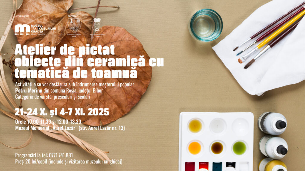 Muzeul Țării Crișurilor Oradea – Complex Muzeal organizează, în parteneriat cu Consiliul Județean Bihor și Primăria Municipiului Oradea, atelierul de pictat obiecte din ceramică cu tematică de toamnă. Acesta se adresează preșcolarilor și școlarilor și va avea loc la Muzeul Memorial „Aurel Lazăr” (Str. Aurel Lazăr, nr. 13).