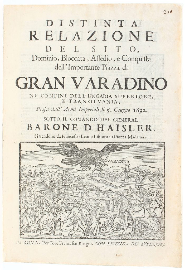În 1692, Oradea era cucerită de armata Sfântului Imperiu Roman (Imperiul German), devenind parte a Occidentului, cu denumirea Oradea Mare, aici sub forma italiană Gran Varadino