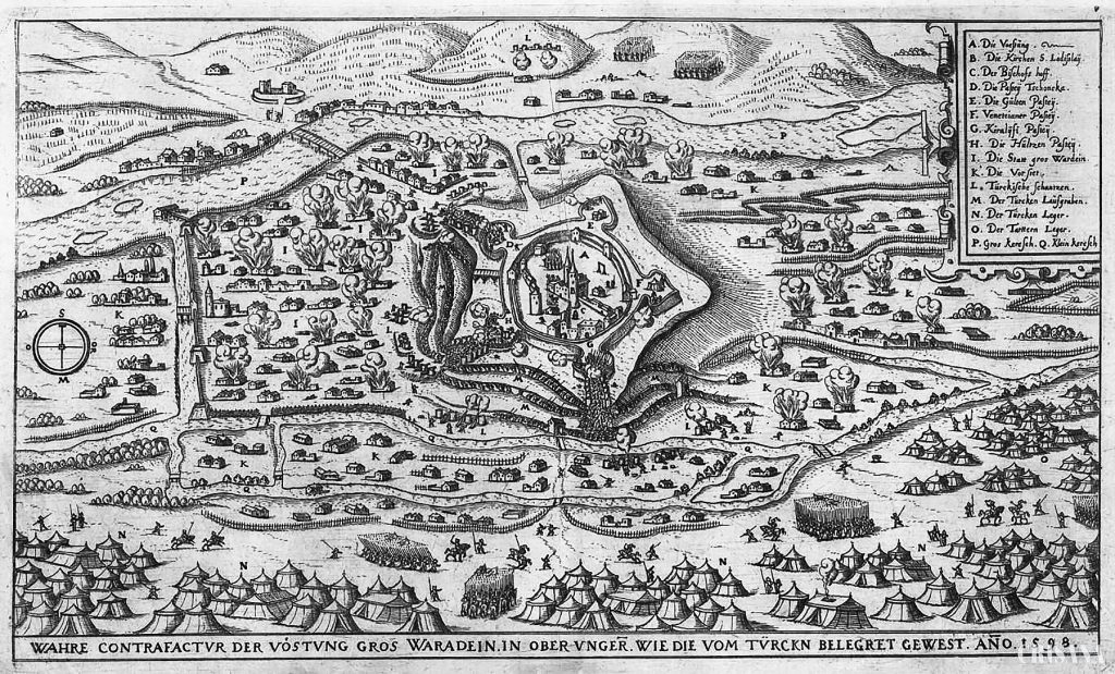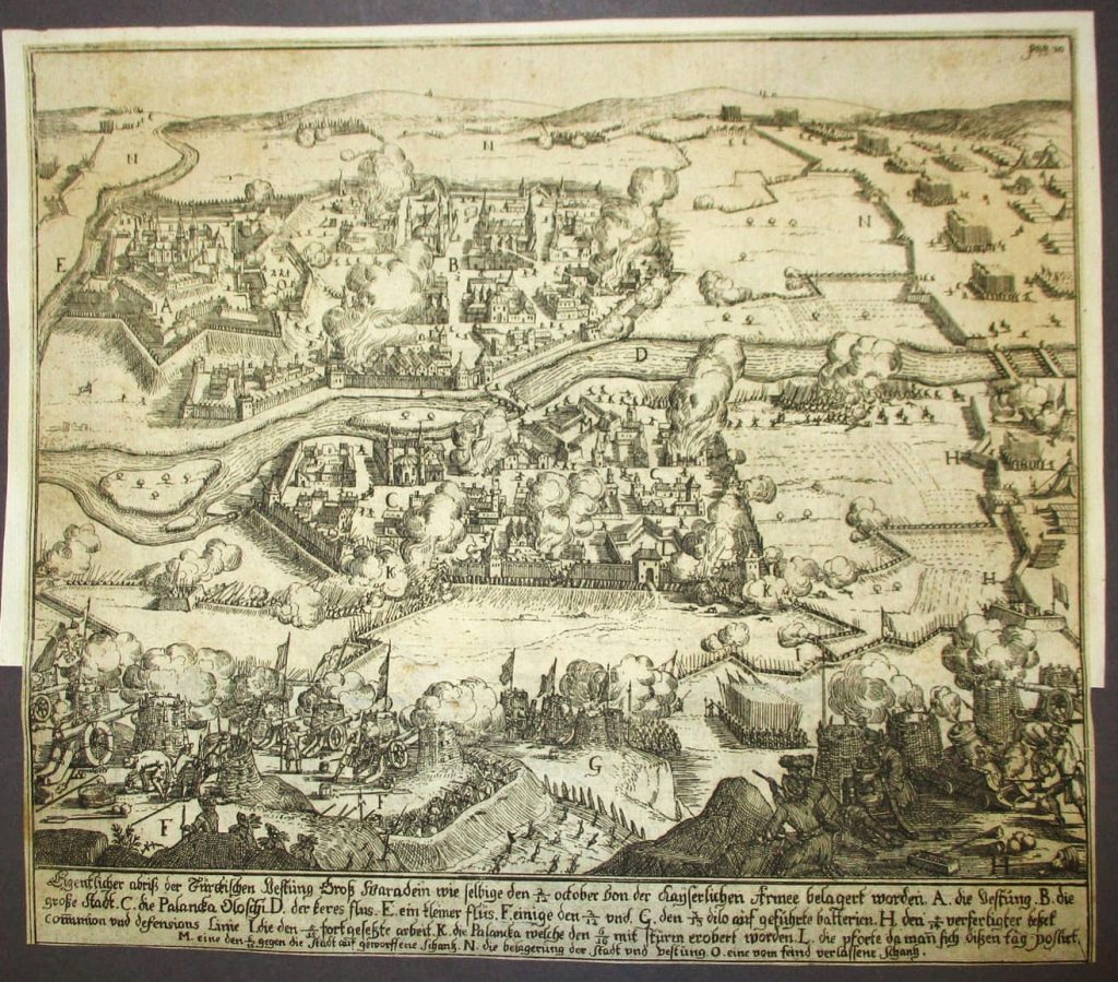 Asediul Oradiei de către austrieci, în 1691. E singura imagine cu orașul turcesc, unul plin de moschei și ziduri de apărare. În 1692 orașul era complet distrus…