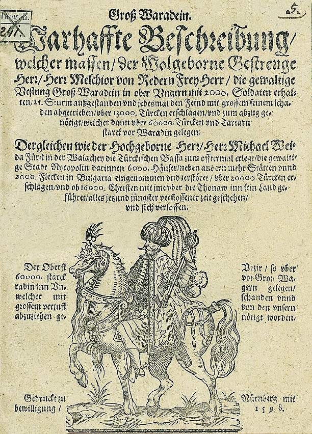Coperta broșurii de 16 pagini pe care apare pentru prima dată denumirea Oradea Mare, în forma germană Gros Waradein, document tipărit la Nurnberg, în 1598, reluat apoi în 1599 într-o nouă ediție