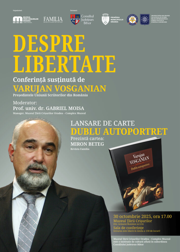 Muzeul Ţării Crişurilor Oradea –Complex Muzeal organizează împreună cu revista Familia și în parteneriat cu Consiliul Județean Bihor, Primăria Municipiului Oradea și Facultatea de Istorie, Relații Internaționale, Științe Politice și Științele Comunicării a Universității din Oradea, conferința Despre libertate, susținută de Varujan Vosganian, președintele Uniunii Scriitorilor din România.