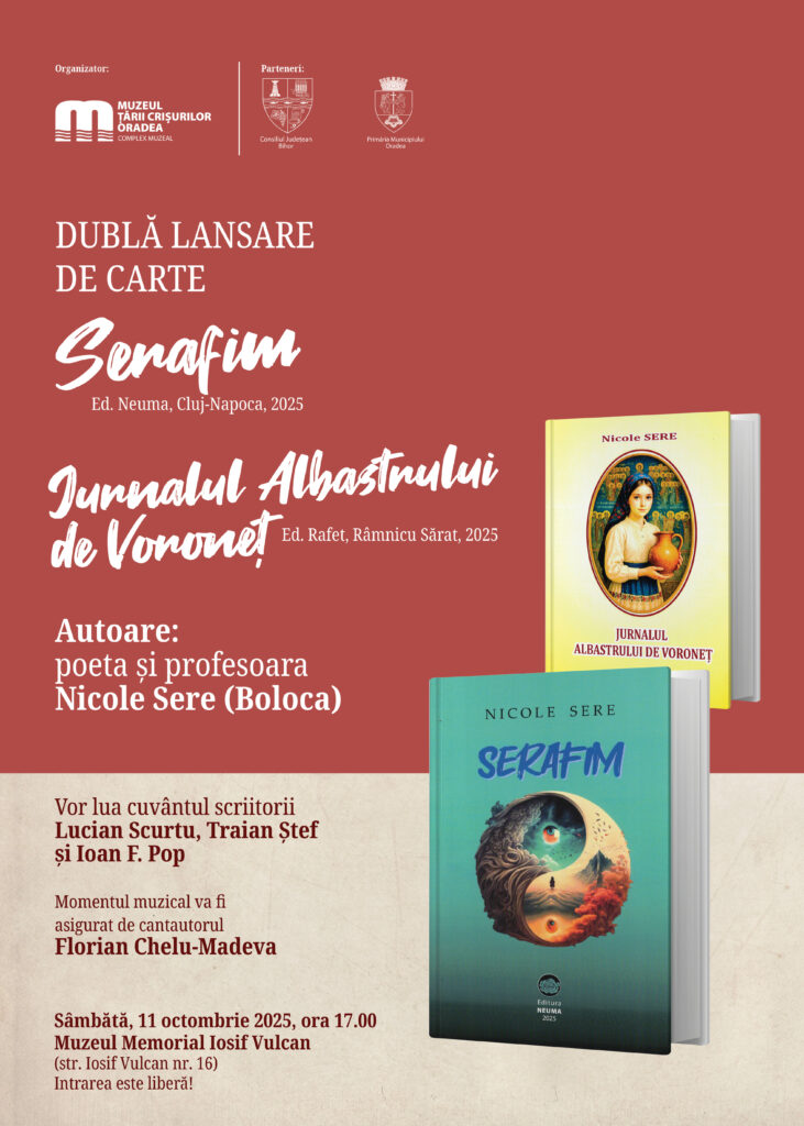 Muzeul Ţării Crişurilor Oradea organizează lansarea a două cărți aparținând poetei și profesoarei Nicole Sere (Boloca): Serafim, Ed. Neuma, Cluj-Napoca, 2025, și Jurnalul albastrului de Voroneț, Ed. Rafet, Râmnicu Sărat, 2025.