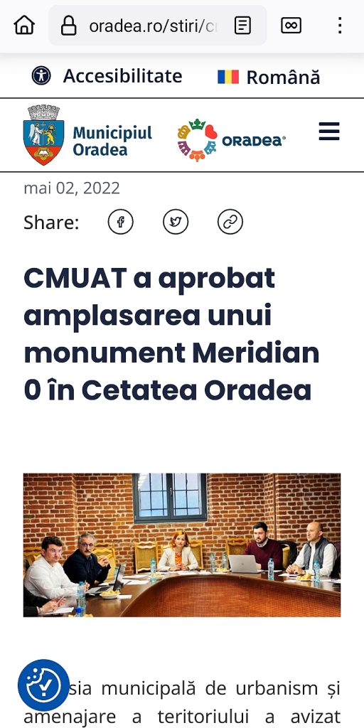 Desigur, sursa încurajărilor în această minciună este chiar Primăria: Comisia municipală de urbanism și amenajare a teritoriului a avizat favorabil proiectul Asociației Club Lions Oradea de amplasare a unui monument „Meridian 0″ în incinta Cetății Oradea, pe axa fostului Meridian 0, în zona Bastionului Crăișorul. „Încă de la începuturile sale, Cetatea Oradea a constituit nucleul vieții administrative, politice, militare, juridice şi religioase. Așa cum se știe, mai bine de două secole, Meridianul 0 era situat în Cetatea Oradiei, iar hărțile întocmite la acea vreme foloseau meridianul Oradiei ca meridian 0°. Astfel, proiectul monumentului a fost prezentat comisiei într-un limbaj artistic contemporan printr-o sculptură urbană ambientală. Baza monumentului va fi una rotativă, armonizată cu mișcările soarelui. Prin urmare, sculptura va face o rotire completă în 24 ore, ceea ce va crea minimum 24 de poziţii diferite ale acesteia. Ca entitate plastică, proiectul reprezintă o provocare vizuală modernă, punând laolaltă mișcarea și culoarea într-un singur simbol”, a precizat viceprimarul Arina Moș – după cum aflăm de pe pagina Primăriei, oradea.ro, din 2 mai 2022.