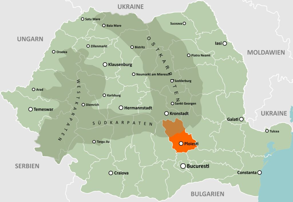 Harta României actuale, în germană, cu conturul județului Prahova umplut cu culoare căramizie. Se vede poziționarea lui în cotul munților, pe ruta Brașov (Kronstadt) – București